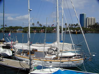 We were understandably very pleased to see Koko Head on Oahu Island appear on schedule and from there it is an hour's sail around Diamond Head to Ala Wei marina and the Hawaii Yacht Club. What an amazing transition. After 19 days, the rolling stops and we glide to a stop against the dock with strangers calling their welcome "Aloha's" and tying us up. All around are the exotic towers of Waikiki apartments, blue seas with waves breaking on white sands while the Yacht Club sits on a peninsular surrounded by palm trees, frangipanis and cool, green grass.