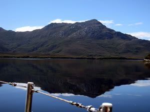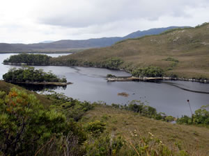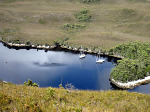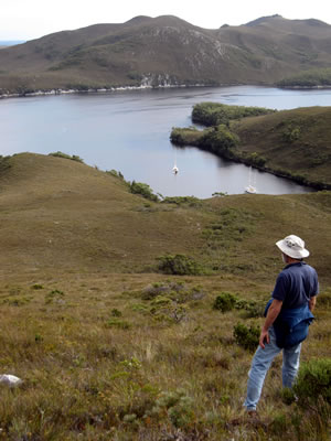 Passage Plan The topography of the coastline around the south of Tasmania to Port Davey is rugged. Recherche Bay is the last anchorage at the south of the D'Entrecasteaux Channel and further south from there is uninhabited. Fishermen looking for crayfish and abalone use the several bays there for shelter from NW'ly winds but these swing through the W to SW and mostly these anchorages are untenable. From the safety of Recherche Bay, one should plan to sail the 80nm distance when the weather offers a 12-hour break. We waited for a good forecast and had the pleasure of a fine sunny day as we traversed Tasmania's southern shoreline, motorsailing. Illywhacker now has a new 70hp Yanmar which helped to ensure our arrival at Bramble Cove in the shelter of Port Davey, well before dark. A cold front forecast however, convinced us to move further inland and we travelled east, following the Bathurst Channel seeking protection from the predicted westerly blow. First stop was Wombat Cove where the special nature of the area became apparent. A Special Environment Port Davey is the name of the outer basin on Tasmania's SW coast. A number of anchorages allow dinghy exploration adventures as well as excellent fishing there and up at Payne Bay in the north. From this large bay, the Bathurst Channel heads east for some 7nm to Bathurst Harbour. From Bathurst Harbour the Melaleuca Inlet runs SE for 5nm to a lagoon of the same name - a very remarkable place with a fascinating history.