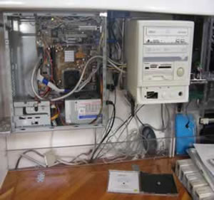 Illywhacker's Second "New Computer System" The "new " computer system had one major failing. As we discovered, the cooling fans made too much noise. Even by running them at a lower voltage to make them run more quietly we needed more so the net result was a background whirr that spoiled the effect. The project is all about high quality audio and video so this installation went to our grandsons who are gaming enthusiasts. They appreciated the performance and noise wasn't a great concern! The replacement is based on a "barebones" chassis - a Shuttle SD36G5M. It is super-quiet and is designed to run as a media centre. The screen is a 16:9 configuration making the combination ideal for digital TV and DVD as well as an impressive platform for charts and photos. 1 Computers are an essential part of our cruising life aboard illywhacker. My notebook pc has for many years been the repository for my lifes details and since moving aboard this time, about 4 years ago, it has been the heart of the boat also. 12 months ago, this obsession became too much for Lyndall so she now has one too! We recently changed my notebook so now we have 2 identical units, a situation which I believe to be advantageous from a backup and support perspective. Both units have about 3 hours battery life but this is rapidly reducing as we mainly operate plugged in, either via the power supplies to our on-board inverter or to 12v. When we think of it, we operate unplugged to fully discharge the battery before charging up again. The new units are non-brand name cheapies with 266mhz chipsets, 64mb RAM, and 2 and 3.5 Gb hard disks. They have both resident CD and floppy drives. Very nice units, probably over the top if they were to be used for just cruising programs 2 We have a dry boat (relatively) and have had no problems with dampness in any of our domestic electronics; microwave, VCR, TV, Hi-Fi as well as in our computers and accessories. The price structure of computers makes it hard to justify a rugged, waterproof type vs a standard notebook so we suffer the usual notebook problems associated more with a cheap unit rather than because it is in a boat. In our case, a floppy drive replacement was required and one screen is a bit dicky, both common in notebooks. When the price of flat, stand-alone LCD screens comes down, I will be tempted to upgrade to a desktop model dedicated to cruising and boat management programs, putting the case in a locker with just the full-size keyboard on the nav table and the screen on a swing-out bracket. (see proposal) 3 We use the computers all day, in port, at anchor or at sea. They are our personal and cruising record systems and source of great entertainment (and frustration). 4 They are used for: · Relaxation games, Lyndall is hooked on Freecell, Scrabble and Bridge, I like chess and we are trying to learn others · Communication e-mail and letter writing to friends, preparing entries to visitors books, hope to set up a web page (at least that's underway) and keep it up to date · Cruising business crew lists, entry and visa requests · Voyage planning optimising where we will be when · Tide - much easier with one program for the whole world · Navigation hoping to get pc chart software soon (couldn't live without it now) · Weather by HF radio fax, an important part of the pc use at sea · Boat management I am writing an Operations and Repair Manual for the boat. It is ongoing and aims to fully document illywhacker's construction in all its aspects, mechanical, electrical, plumbing, refrigeration, sailing etc and to provide background and repair advice for others on board. It is a way of both recording the documentation needed to manage the yacht and to attempt to explain it all to someone seeing it for the first time. Since this project was started, new web-page software has enabled me to rewrite this as a hypertext document, so more fun ahead! · Photography the purchase of a digital camera has opened up a whole new world. We take many more pictures, can modify them and include them in letters and the log. We are still discovering new ways of cataloguing, producing slide shows and so on. Due to the radio e-mail limitations we are obliged to send the results of these creations by disk or over internet if we can find an internet café. · Learning we have a number of teach-yourself CDs, including Japanese which Im sure normal cruisers would have no difficulty with at all. For me however . · Encyclopaedias and Atlases often used to settle arguments and to dream of distant places. 5 E-mail aboard illywhacker is primarily via Ham radio. It has the advantage of being free though sometimes slow, probably the same performance as commercial HF SSB services. Until Iridium becomes cheaper with data capability I will stick with my Ham radio. I also have a Hotmail address which I can use from the local café for the occasional surf or to send or receive heavy files. 6 At this stage in Japan, we have yet to find a friend ashore with an ISP connection to allow us to connect directly from this computer, so forays ashore are without the computer but with a disk in my pocket. Thus I either send my large files or photos over Hotmail or post them. I am not convinced that the monthly charges of a world-wide ISP such as Compuserve or AOL is warranted for us, requiring connection via a public telephone using either an analogue or ISDN connection. The use of older acoustic couplers for this task seem to negate the advantage of finding a faster landline over using HF aboard. 7 Any surfing we do is during our stints at home or when staying with friends and family. Our computers are with us as cabin baggage on the flights home, they never leave our sides! During bath times for the grandchildren when grannies are best out of the way, we do a little surfing and collect as much stuff as we can for later reading aboard. 8 I have my notebook in its carry case which has large velcro straps stuck on to hold it to match