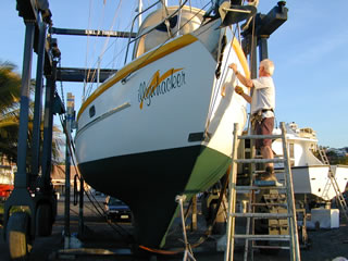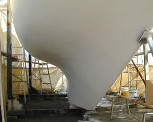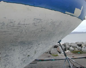 Several damp patches were visible through the epoxy sheathing so the Paint rep recommended a water blast to ensure that only fresh water remained. The contractor unfortunately used a high pressure blast and a large section of the sheathing came away at the first squeeze of the trigger. I had no option but to agree to all of the material being removed - back to a ferro surface. The paint rep used this opportunity to recommend application of a glassfibre-impregnated epoxy coating of 600 microns. This was applied after the above waterline finish was completed to allow maximum time for the hull to dry out. The contractor had the equipment to spray such a thick paint and laid up layer after layer wet on wet until it suddenly became too heavy and sagged, dripping to the ground - what a mess! After a difficult sanding the finish below waterline was worse than before with an indeterminate thickness. A binder then antifoul were applied over this surface.