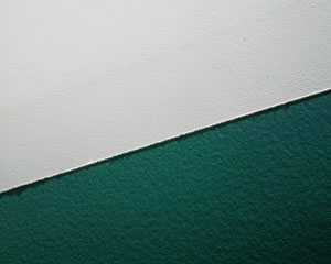 The contractor arrived with an impressive array of equipment ready to strip the hull, above and below the waterline and quickly erected the protective barrier required by the EPA to prevent dust dissemination. The plan was to use a bicarbonate waterblast technique which allows a fine control over the paint removal process. Unfortunately the contractor was unable to produce an EPA license but he and his team cheerfully set about hand sanding. Removal of the underbody paint was achieved over a period of several days producing a good finish back to the epoxy coating (see photo). As the above waterline finish exhibited an area in which the polyurethane paint had peeled from the epoxy hi-build below, it was decided to attempt to encourage this through the use of masking tape to peel away all of the old paint - an idea that worked very well after we left it for a few days before peeling it away. This method ensured the original hull fairing was retained, something we felt sanding would have been unable to achieve.